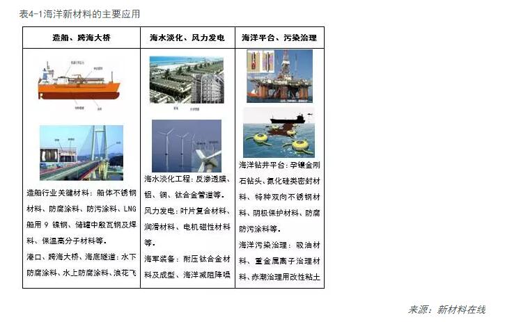 所謂海洋新材料,宏觀(guān)上是指能從海洋中提取的材料和專(zhuān)屬用于海洋開(kāi)發(fā)的各類(lèi)特殊材料。海洋新材料的主要分類(lèi):海洋用鋼(鋼筋和各類(lèi)不銹鋼)、海洋用有色金屬(鈦、鎂、鋁、銅等)、防護材料(防腐、防污涂料、犧牲陽(yáng)極材料)、混凝土、復合材料與功能材料等。海洋新材料的主要應用:造船、港口碼頭及跨海大橋、海底隧道、海洋平臺、海水淡化、沿海風(fēng)力發(fā)電、海洋軍事等。