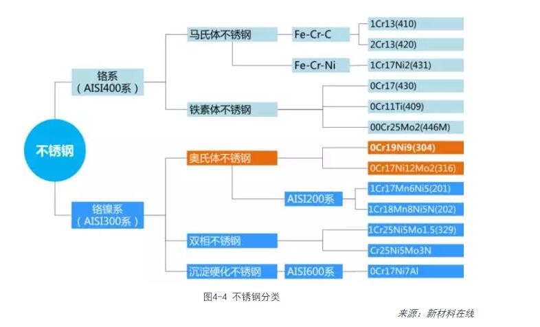 根據化學(xué)成分,不銹鋼可分為鉻系不銹鋼和鉻鎳系不銹鋼,其中鉻系不銹鋼包括馬氏體不銹鋼和鐵素體不銹鋼,鉻鎳系不銹鋼包括奧氏體不銹鋼、雙相不銹鋼和沉淀硬化不銹鋼。0Cr18Ni9奧氏體不銹鋼,即304不銹鋼是應用最為廣泛的不銹鋼之一。