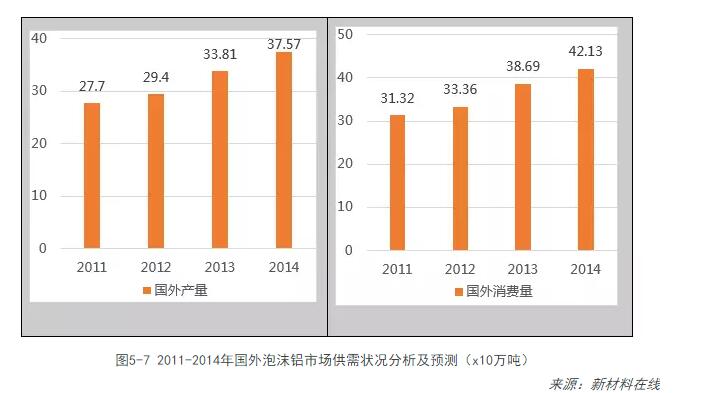 2013年國外泡沫鋁市場(chǎng)產(chǎn)量達到338.1萬(wàn)t,預測2014年國外泡沫鋁市場(chǎng)產(chǎn)量達到375.7萬(wàn)t。