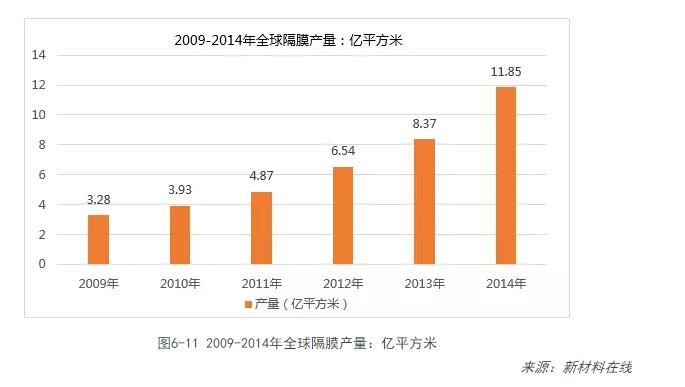 受益于2014年動(dòng)力電池市場(chǎng)的快速拉動(dòng),全球鋰電池隔膜產(chǎn)量增長(cháng)幅度明顯。統計數據顯示,2014年全球鋰電池隔膜整體產(chǎn)量為11.85億平米,同比增長(cháng)41.58%,增幅明顯高于2013年的27.98%。