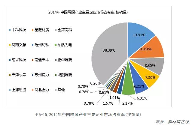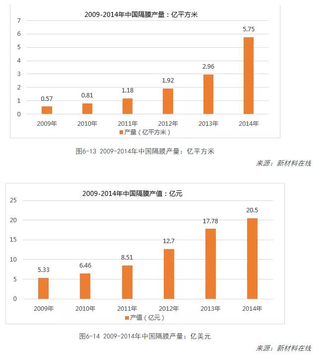 中國市場(chǎng)隔膜的出貨量在2014年得到了大幅度的提升,統計數據顯示,2014年整個(gè)中國的隔膜產(chǎn)量達到5.75億平方米,占據全球產(chǎn)量的大約48%左右,但是主要集中在低端的干法隔膜產(chǎn)品領(lǐng)域。