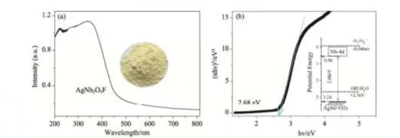 AgNb2O5F光化學(xué)和抗菌性能,和一般報道的氧化物半導體(如 TiO2, ZnO 和 Nb2O5等)相比,AgNb2O5F具有一些獨特的優(yōu)勢。首先,從結構上來(lái)看,在一些含氧的多面體(如 PO4, BO4, NaO6, TiO6等)中,眾所周知,氟的電負性遠大于氧,氟離子的摻雜勢必增強對電子云的吸引力,從而大大增強中心離子和配位離子的鍵強,所以,晶格中 F離子的存在使得晶格的連接強度更加具有剛性,由此提高材料的物理和化學(xué)穩定性。第二,實(shí)驗研究已充分證實(shí),半導體價(jià)帶中(Ag 4d+O 2p)的雜化,可以大大縮小半導體的帶隙,因此,可以有效地利用可見(jiàn)光實(shí)現光催化抗菌消毒。